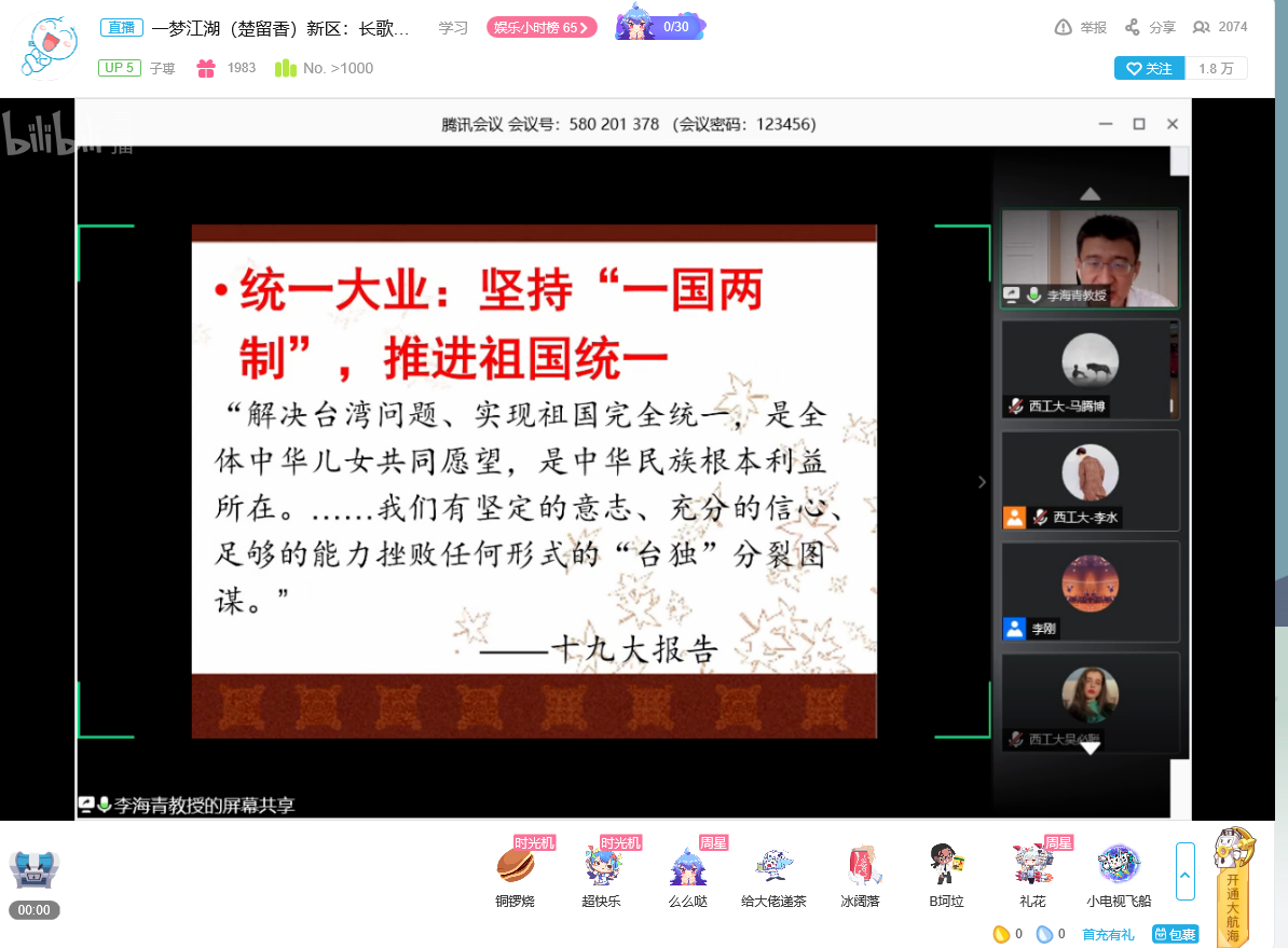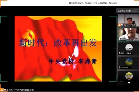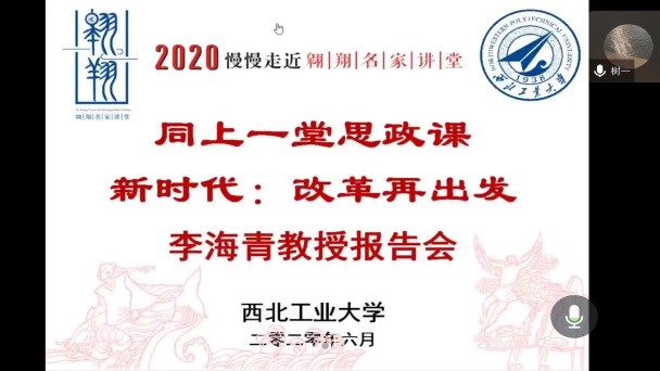2020年6月4日上午,中共中央党校李海青教授应邀作客我校翱翔名家讲堂,在网络平台为广大师生带来了一场主题为《同上一堂思政课——新时代:改革再出发》的精彩报告。来自北京市委党校、山东大学、太原理工、西南交大、东北师范大学、兰州理工和我校的共2300余名师生通过腾讯会议和B站,聆听了李教授的讲座。本次翱翔名家讲堂由必赢242net官网党委学生工作部主办,必赢242net官网、软件学院、航天学院联合承办,报告会由必赢242net官网副院长郝保权主持。