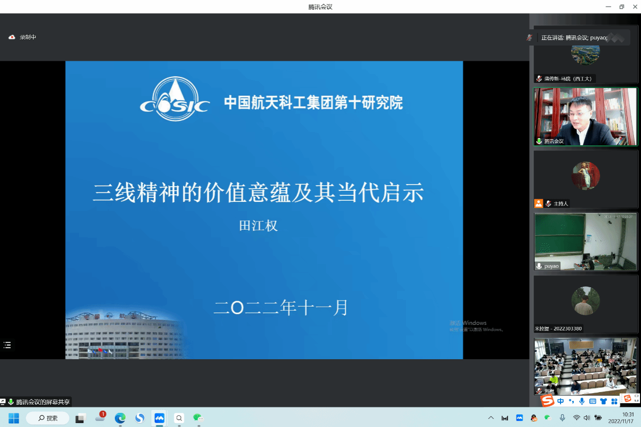 为深入贯彻落实习近平总书记关于“大思政课”的指示批示,深化巩固“四史”教育的课程效果,11月17日,我校邀请到中国航天科工集团第十研究院田江权高级工程师做客翱翔名家讲堂,在云端开展《三线精神的价值意蕴及其当代价值》思政课程交流。本次活动由党委学生工作部主办、必赢242net官网承办。必赢242net官网党委副书记(主持工作)蒲传新、院长助理赵海霞,陕西省思政名师工作室负责人蒲瑶,思政课教师马新蕊、山磊、杜轶伦,以及《中国近现代史纲要》课程的学生共500余人参加了学习。