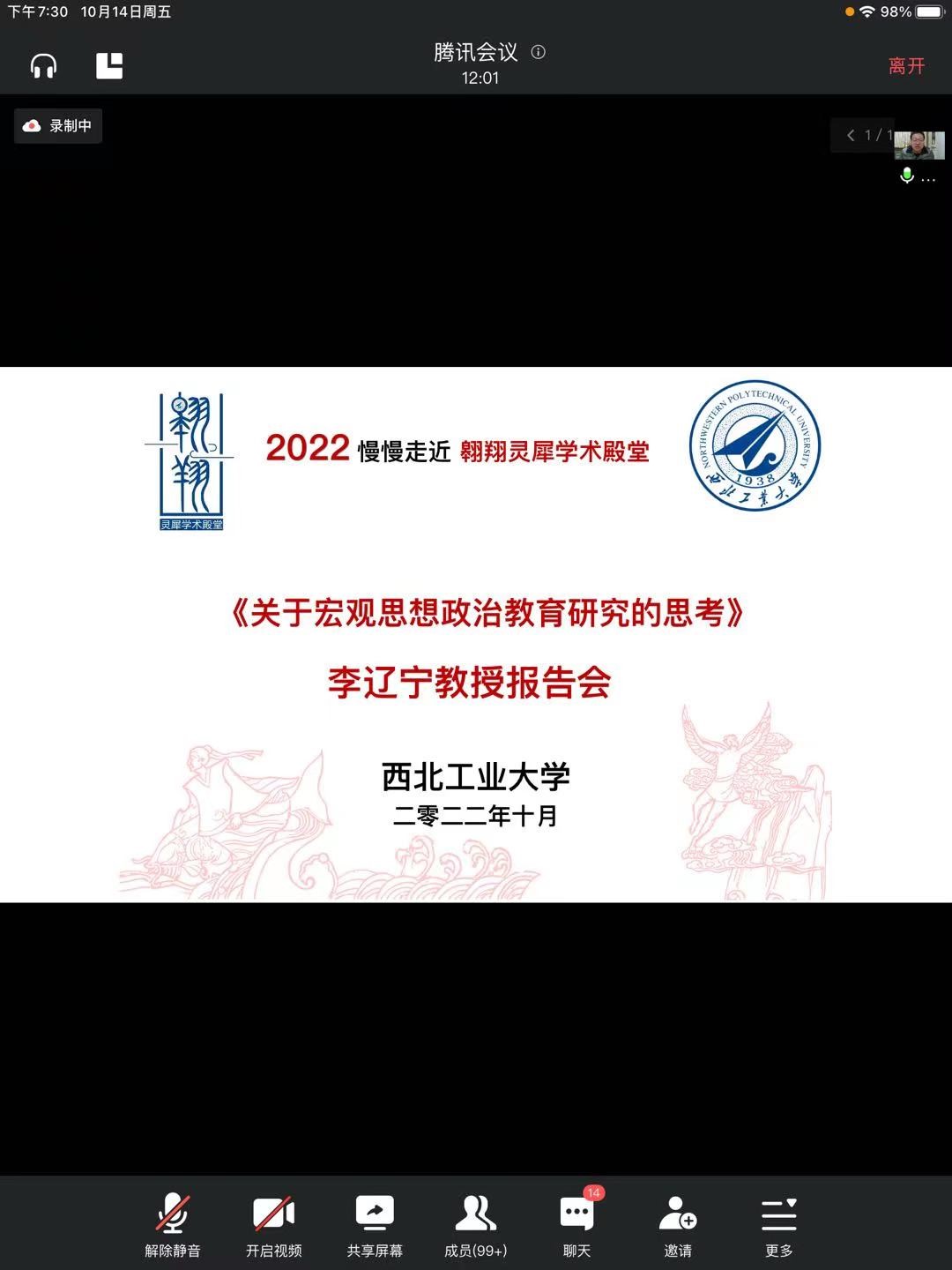 2022年10月14日晚19:30,国家社科基金重大项目首席专家、国家社科基金年度项目通讯评审专家、四川大学必赢242net官网李辽宁教授应邀做客我校“翱翔灵犀学术殿堂”,通过腾讯会议平台直播的形式为我们带来了一场主题为《关于宏观思想政治教育的思考》的精彩报告。必赢242net官网思想政治教育系主任鲁杰教授主持报告会,来自必赢242net官网、四川大学、东北大学等200余名师生共同参加了此次活动。
