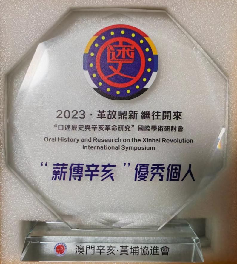 会议采取线上、线下方式同步进行,与会专家学者、辛亥志士后裔就口述史学与辛亥革命研究的现状、交汇及意义,辛亥历史文化的保存、构建及传播,辛亥革命研究的深化等问题展开深入讨论,并交流了“辛亥志士后裔口述史”项目的第一批访谈成果。我院院长助理赵海霞副教授应邀参会并作线上发言,向与会代表介绍了参与“辛亥志士后裔口述史”项目,对樊耀南曾孙樊斌进行口述历史采访的情况。赵海霞副教授的相关工作得到了大会的充分肯定,被授予“薪传辛亥”优秀个人奖杯。