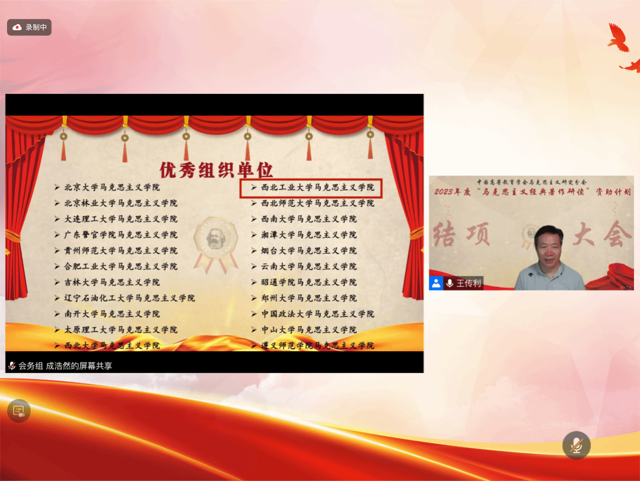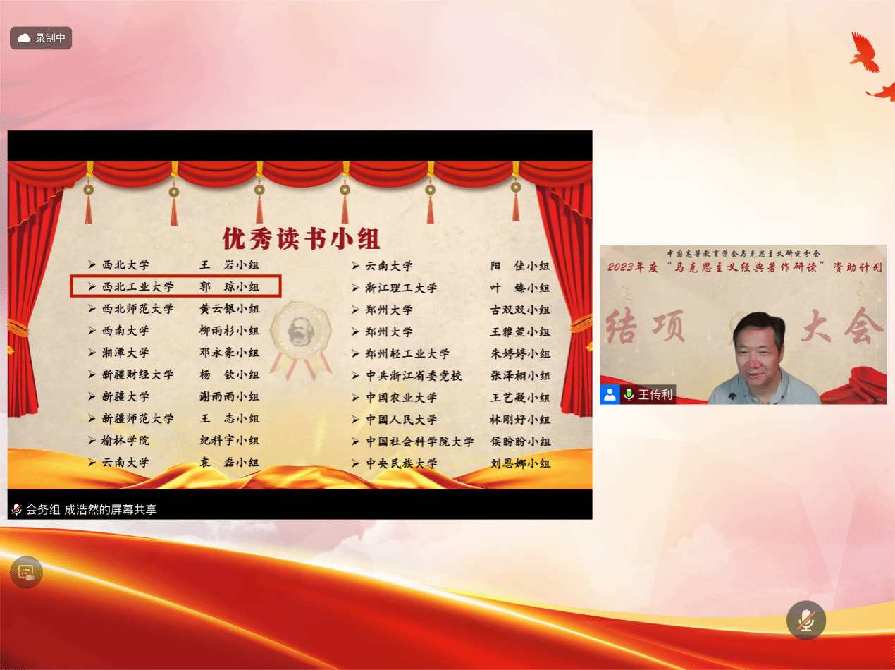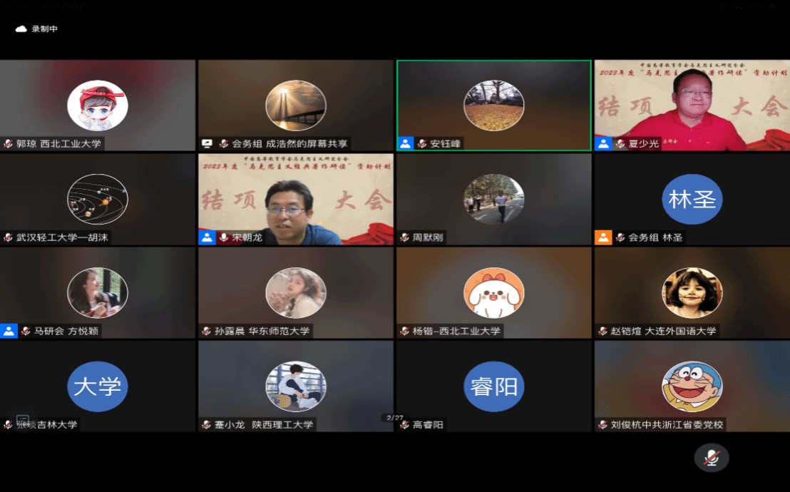 2024年7月25日,中国高等教育学会马克思主义研究分会(以下简称“马研会”)“马克思主义经典著作研读”资助计划结项交流大会顺利召开,会议由北京大学必赢242net官网助理教授、马研会副秘书长夏少光主持,马研会领导、理事、百强读书小组全体成员及指导教师、马研会秘书处志愿者等近600人出席会议。经马研会资助计划组委会评审,我校“习近平新时代中国特色社会主义思想学习读书会”顺利结项,必赢242net官网成功入选2023年度优秀组织单位,“习近平新时代中国特色社会主义思想学习读书会”也荣获“优秀读书小组”称号。