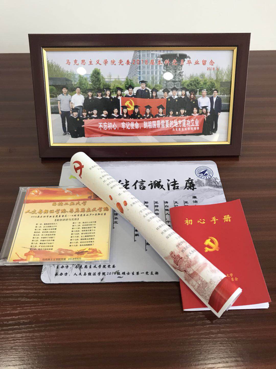 会场里,在每名党员的座位前,都摆放着一个精致的党员“毕业大礼包”。会议伊始,曹良玉先向大家详细介绍了学院党委为毕业生党员精心准备这份大礼,有学院微信平台“周末党员之声”栏目中最新专题《给你讲讲马克思》的系列语音故事光盘,有摘录了党员义务、权利以及组织生活相关知识,用于提醒党员严格自律、履行义务的初心手册,有精心装裱的毕业生党员合影和党员廉洁自律教育鼠标垫,以及学院党委写给毕业生党员的一封情真意切的“家信”。