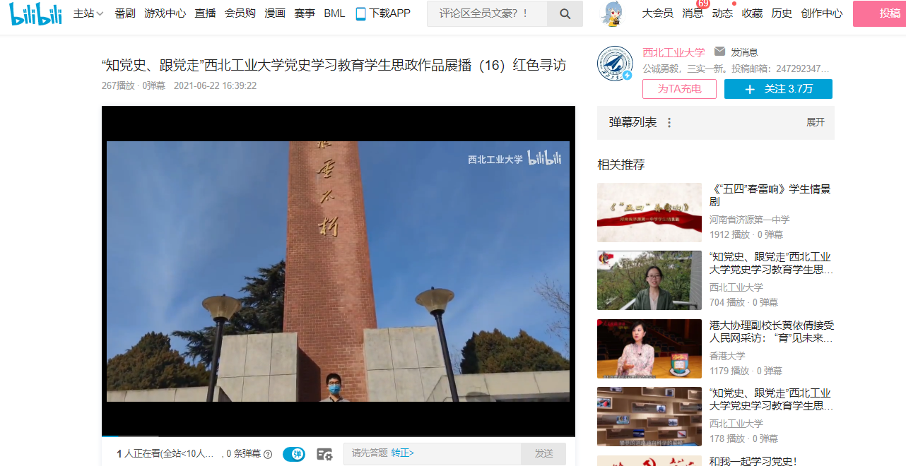 本学期,必赢242net官网举行了“知党史、跟党走”党史学习教育思政作品大赛,经过评比,选出了100个优秀视频并举行颁奖仪式。自6月7日起,优秀作品在必赢242net官网bilibili官方平台展播,至今已有数十个作品在b站与大众见面,这些作品或形式新颖,或史实扎实,或真情流露,都是工大学子用自己的方式向中国共产党成立100周年献礼。