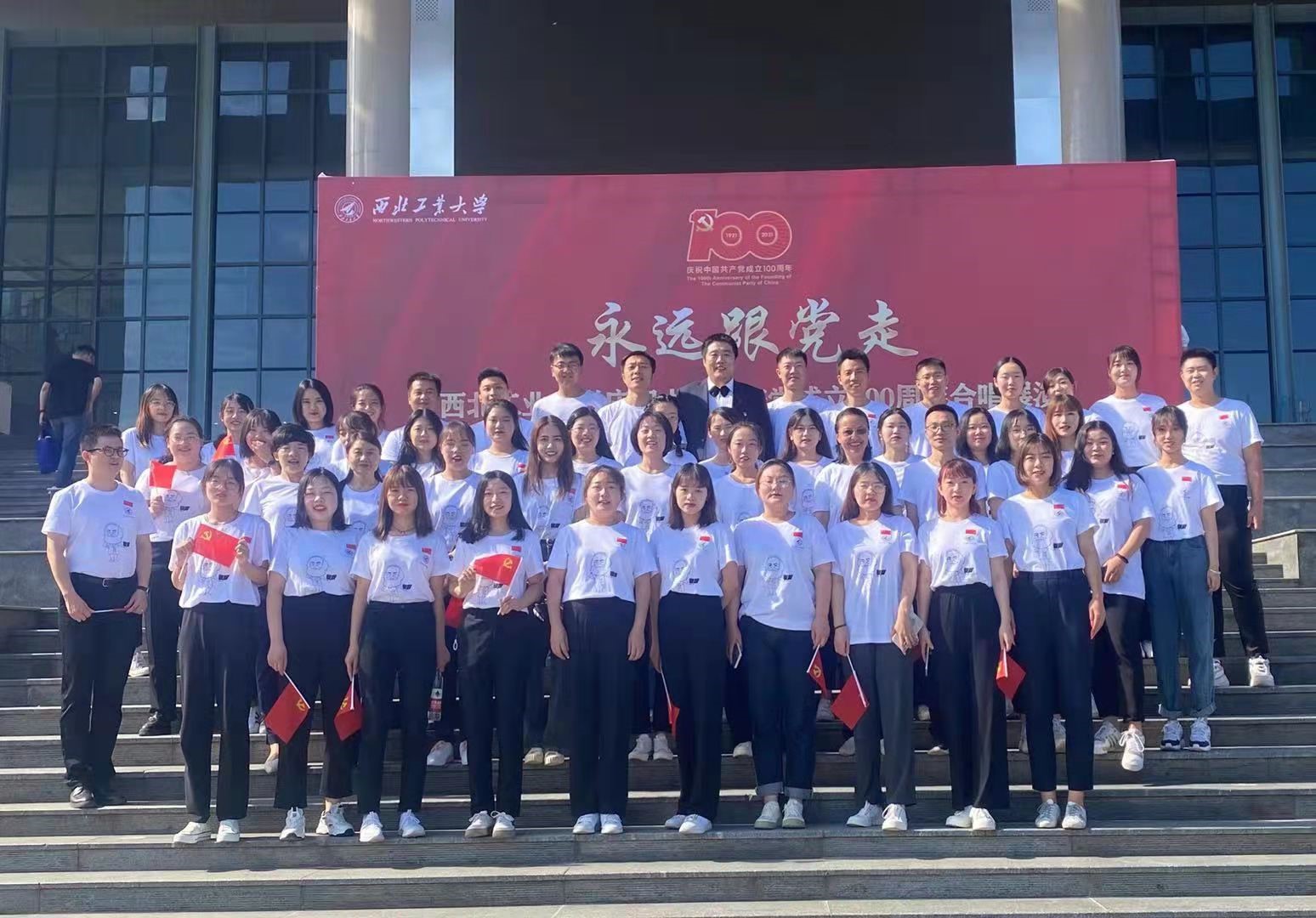 同样在6月19日,“永远跟党走”必赢242net官网庆祝中国共产党成立100周年合唱展演在翱翔学生中心举行。由必赢242net官网党委领衔,近百名学院师生组成合唱团,统一身着定制文化衫,手拿党旗,歌唱祖国《走向复兴》。在歌声响起前,学院还特别设计了朗诵《共产党宣言》的环节,以此来铭记共产党人的初心。