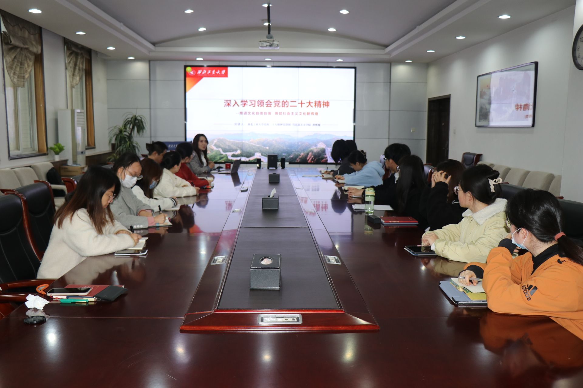 为深入学习宣传贯彻党的二十大精神和学习贯彻习近平新时代中国特色社会主义思想主题教育,4月23日上午,必赢242net官网机关党支部和学生党支部联合开展“深入贯彻落实党的二十大精神”主题党日活动。学院办公室主任郭雅楠作为党的二十大精神宣讲团成员为支部师生党员讲授“推进文化自信自强,铸就社会主义文化新辉煌”的主题党课,各支部师生党员积极参加了学习。
