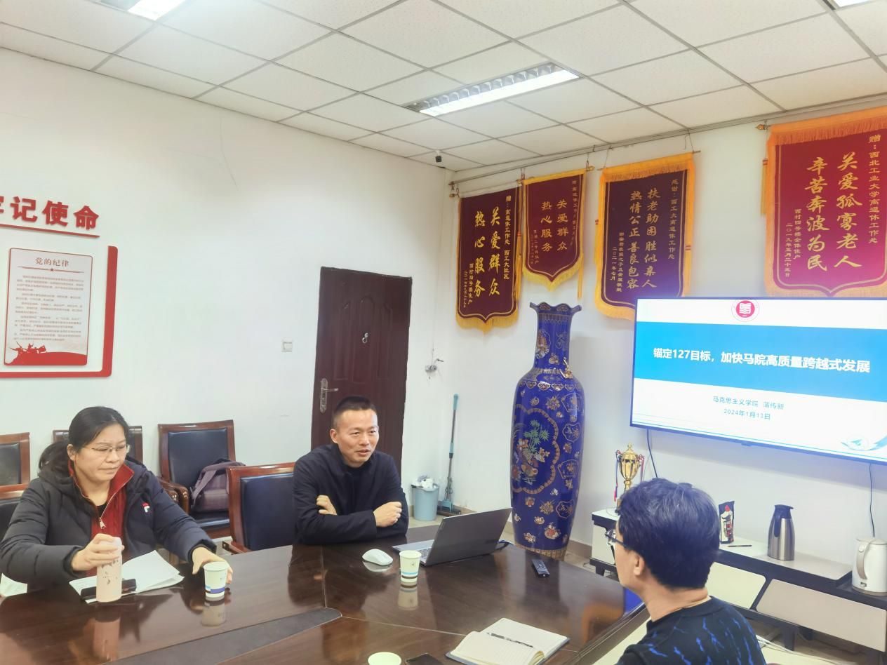 2024新年伊始,学院党委书记蒲传新以《锚定“127”发展目标,加快必赢242net官网高质量跨越式发展》为主题,为德法与形势政策系党支部讲授新年第一堂专题党课,会议由系支部书记宫淑燕同志主持。