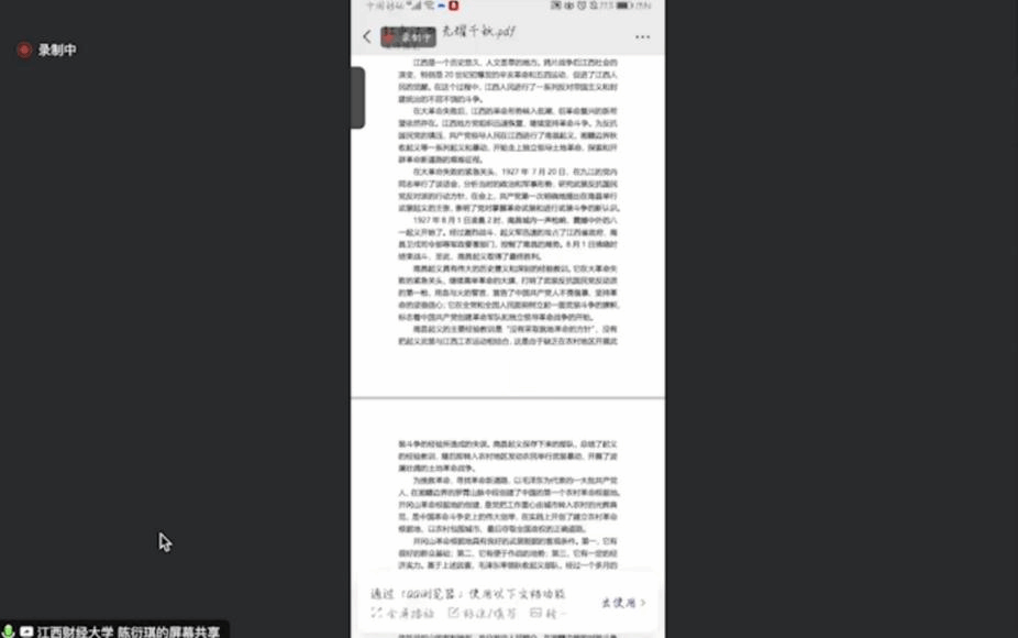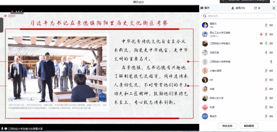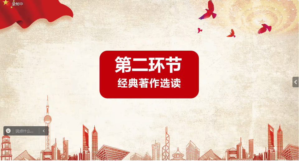第二环节经典著作选读中,由张嘉文、刘垚和邵明岚三位同学围绕中国共产党历届领导人在江西、山东、陕西发表的重要讲话精神及重要文章等进行解读分析,并与当代价值结合展开学习分享和感悟交流。