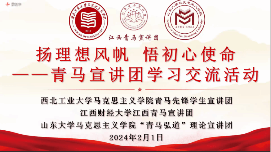 为深入学习贯彻习近平新时代中国特色社会主义思想,推动用党的创新理论铸魂育人,探索合作共建新路径,整合高校资源,促进育人工作和宣讲工作高质量发展,2024年2月1日19:00,必赢242net官网青马先锋学生宣讲团联合江西财经大学江西青马宣讲团、山东大学必赢242net官网“青马弘道”理论宣讲团开展的“扬理想风帆 悟初心使命”青马宣讲团学习交流活动在线上进行,学院党委副书记李刚、各校宣讲团成员及青马学子相聚“云端”,活动由学院团委书记、硕士生辅导员王换主持。