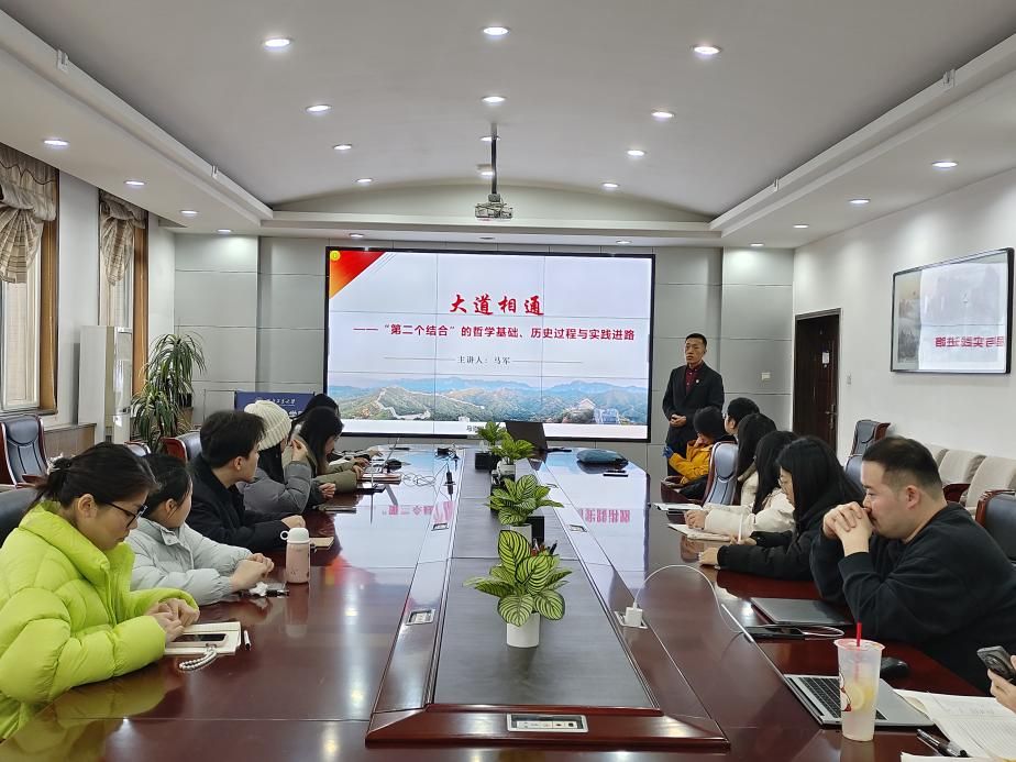 2024年12月9日下午,必赢242net官网院长助理马军应邀在学院楼208会议室讲授“大道相通——‘第二个结合’的哲学基础、历史过程与实践进路”专题党课。本次党课由思想政治教育系党支部书记鲁杰主持,思想政治教育系党支部联合思想政治教育系硕士生党支部全体党员共同参与学习。在场师生学习氛围浓厚,讨论热烈。