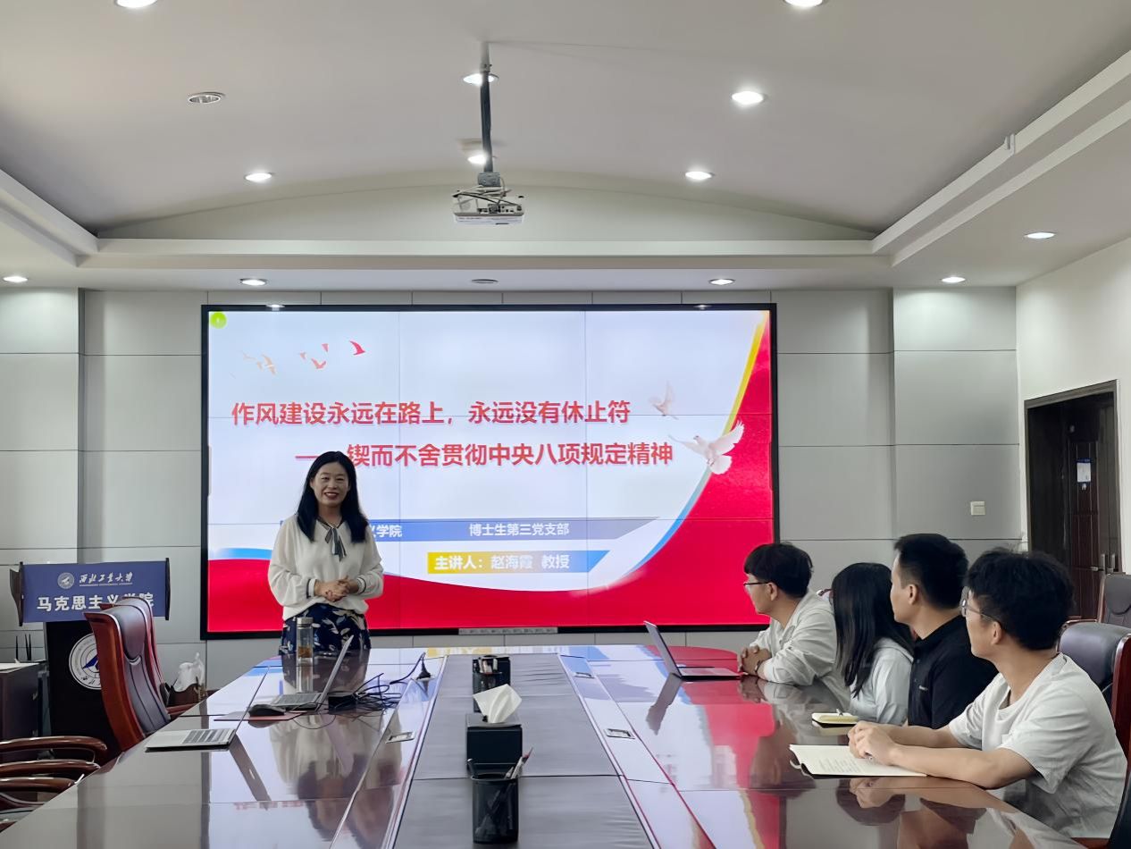 为深入学习贯彻落实中央八项规定精神,持续推进作风建设,营造风清气正的政治生态,必赢242net官网博士生第三党支部于2025年5月15日上午10点,在学院208组织了一场意义深刻的专题党课。此次党课由赵海霞教授担任主讲,支部全体党员积极参与,共同学习交流。