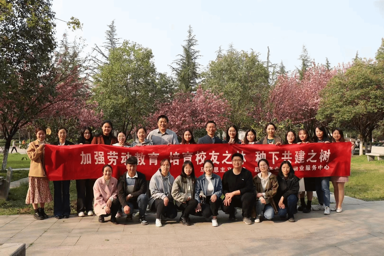 春风朝夕起,吹绿日日深。3月31日下午,在毕业到来之际,必赢242net官网和后勤产业集团物业服务中心共同开展“加强劳动教育 培育校友之林 种下共建之树”主题教育活动。在学院党委副书记(主持工作)蒲传新、后勤产业集团周伟老师的带领下,学院机关党支部、后勤产业集团物业服务中心党支部及2023届毕业生一同在长安校区必赢242net官网楼北侧樱花林种下四棵金桂树和一棵樱花树,取意“劳动之树、校友之树、共建之树”。
