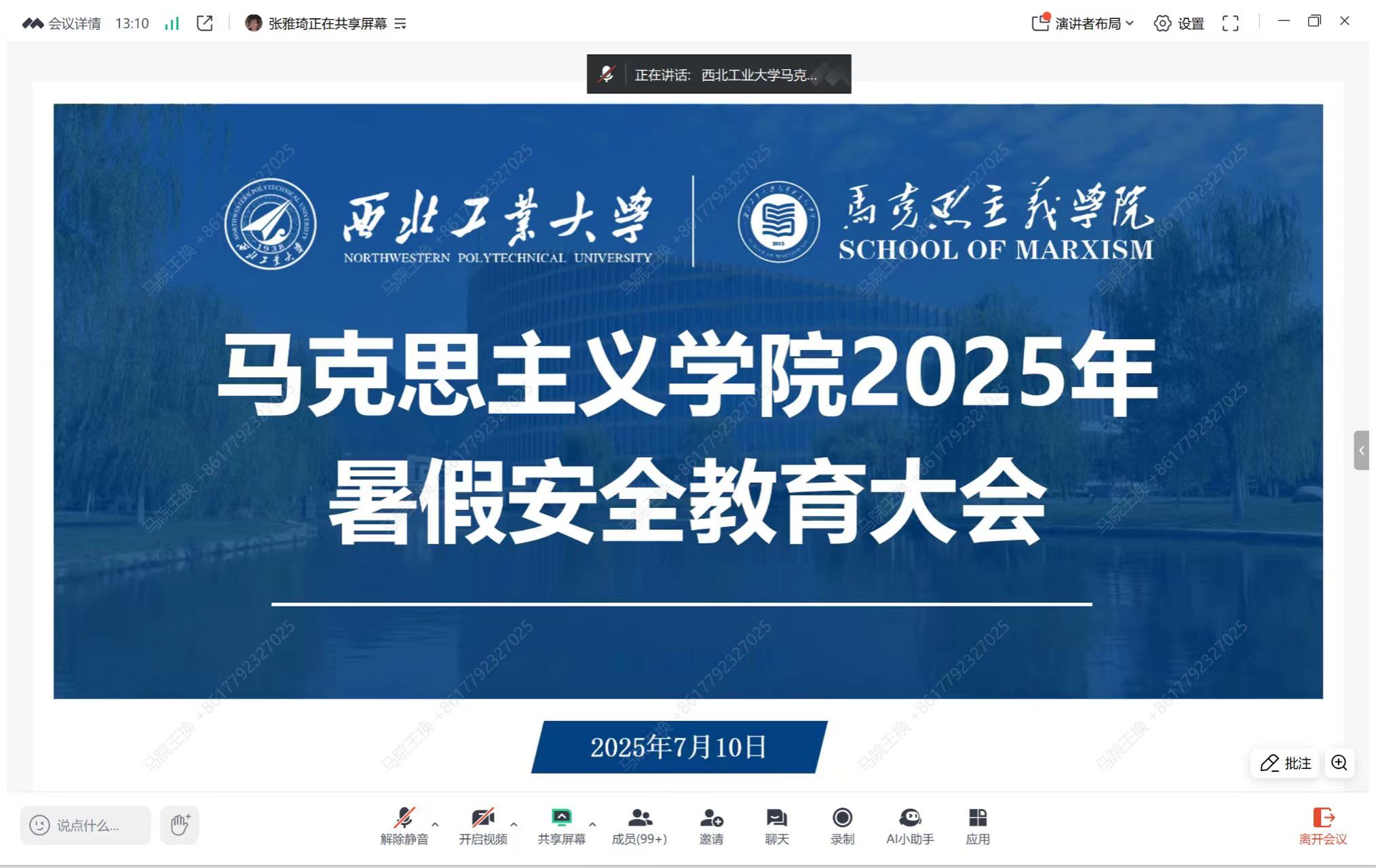 7月10日21:00,学院线上召开暑假安全教育大会。会议由学工主管刘敏主持,学院党委副书记耿云辉,辅导员王换、许斯诺、本科生辅导员董润与全院同学共同参会。会议开始,刘敏详细说明暑假放假及开学时间安排,并对留校学生的管理细则进行细致解读。随后,王换围绕交通安全、饮食安全、人身财产安全几个方面强调暑期安全注意事项,为同学们的假期出行与实践活动划出安全底线。许斯诺通报近期高校热点新闻周报典型案例,结合案例引导同学们掌握科学的压力纾解方法,确保学业与身心状态齐头并进。最后,耿云辉传达学校学生工作会议精神,鼓励同学们利用假期提升综合素养,着重强调要做好身心调适,以积极心态应对挫折与各类心理变化。