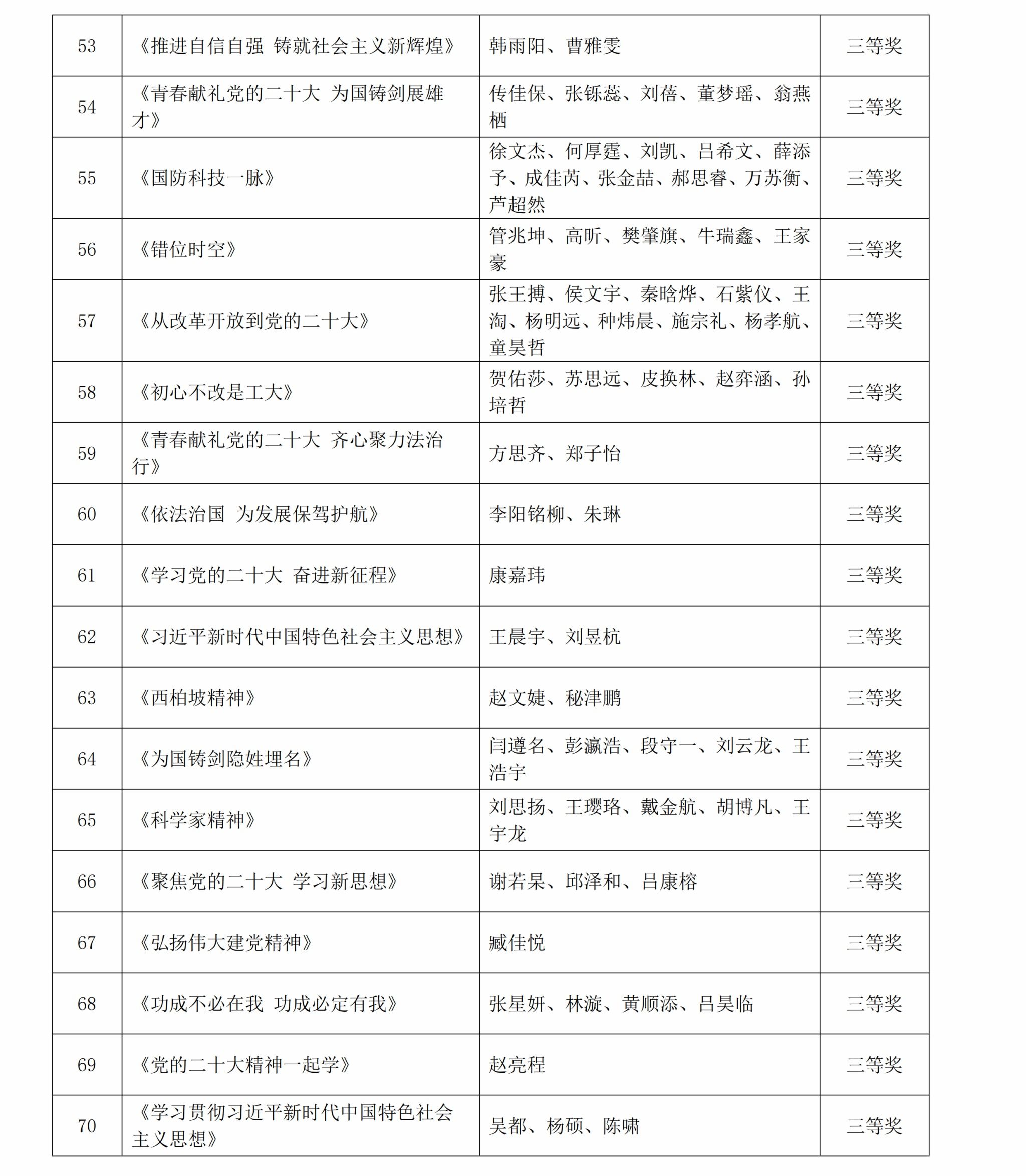 为引导全校学生充分认识党的二十大召开的重大意义,深入学习宣传贯彻党的二十大精神,深刻领会把握新时代新征程的使命任务,切实把思想和行动统一到党的二十大精神上来,把智慧和力量凝聚到实现党的二十大确定的各项任务上来,必赢242net官网党委学生工作部、必赢242net官网面向全校学生开展“学思践悟党的二十大精神 砥砺奋进新征程”第五届学生思政作品大赛。经过前期学生申报,专家评审,现将获奖情况予以公示,接受广大师生监督。公示时间:2023年6月21日至25日。如有疑问请在公示期内与必赢242net官网办公室联系反映。