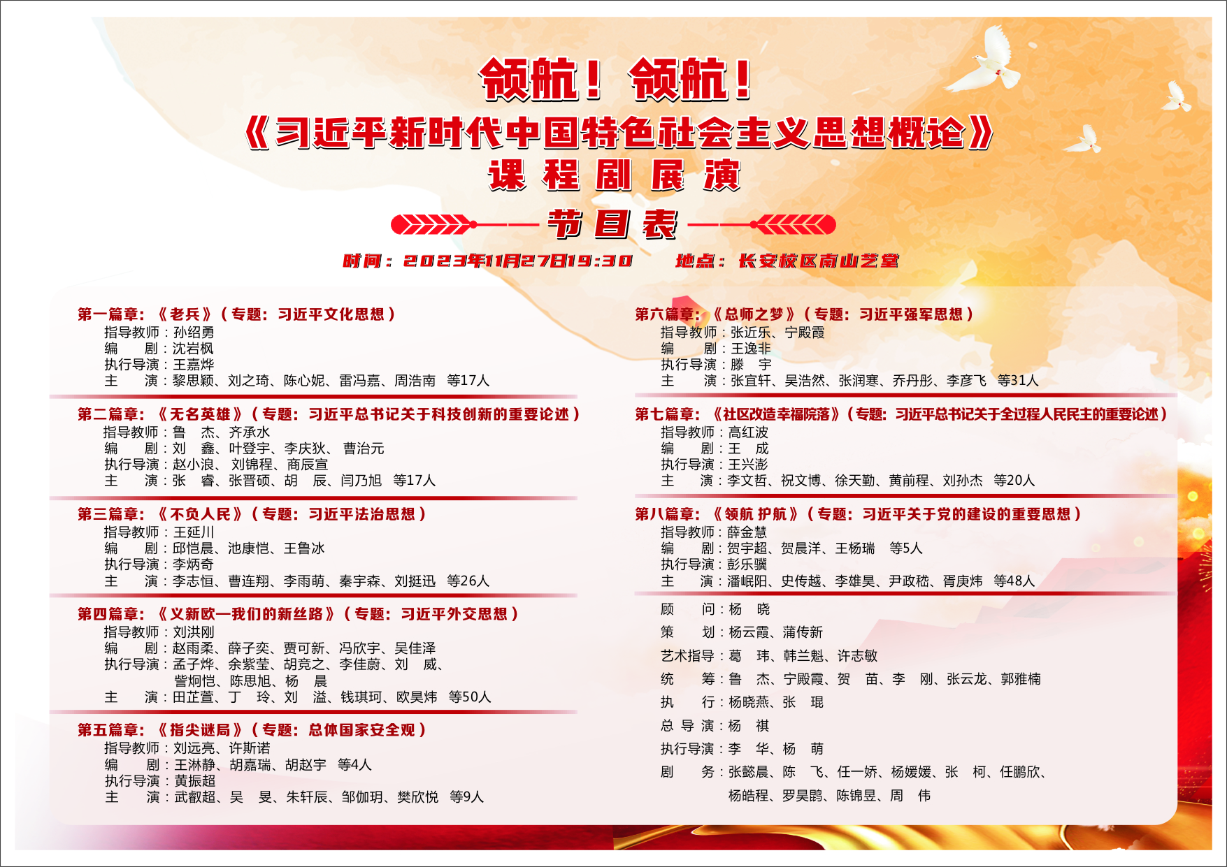 2023年11月27日晚,由必赢242net官网党委宣传部、党委学生工作部、教务处、教育基金会、必赢242net官网主办,校工会、离退休党委、艺术教育中心协办的第二届“领航!领航!《习近平新时代中国特色社会主义思想概论》(以下简称《概论》)课程剧”在长安校区南山艺堂举行。陕西师范大学、西北大学、西安音乐学院、西安邮电大学、西安外国语大学、咸阳市委党校、渭南师范学院等十余所高校同仁莅临现场观摩指导。