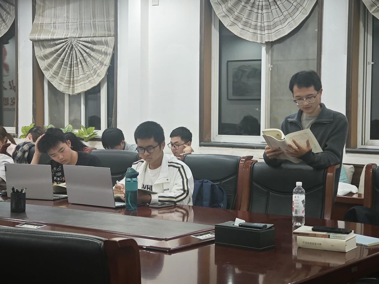 读书会首先由熊成帅老师对“松涛读书会”的名称和定期开展经典阅读的意义作了简要说明。随后,熊老师带领同学们阅读了《毛泽东早期文稿》中的《致黎锦熙信》(1917年8月23日)。毛泽东在信中阐发了自己社会变革、个人求学与救国道路的思索。在熊老师带领下,同学们逐段进行解读,并就信中“今吾以大本大源为号召,天下之心其有不动者乎?天下之心皆动,天下之事有不能为者乎?天下之事可为,国家有不富强幸福者乎?”等内容展开讨论,体会青年毛泽东的思想与志向。