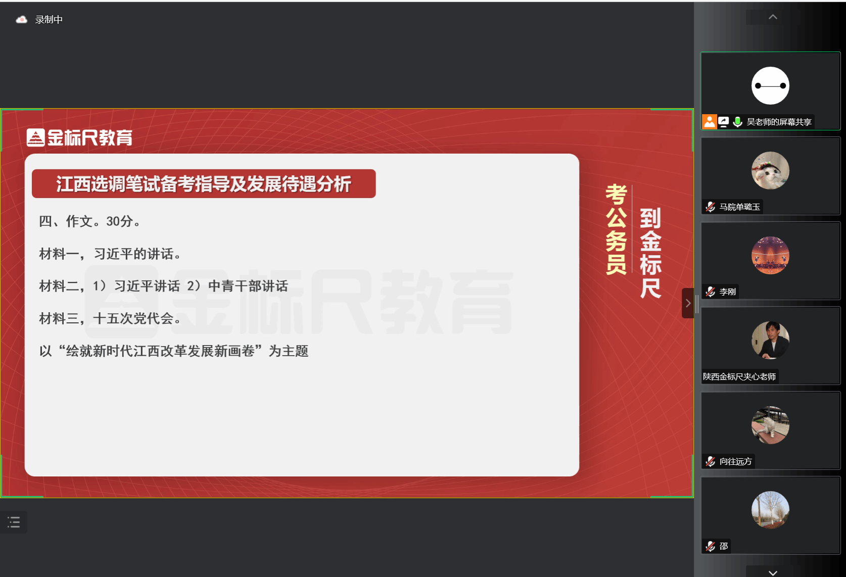 紧接着,吴老师详细讲授了江西选调招录特点及流程。从招录名额上来看:江西省内高校定额,省外高校看报名情况,笔试采取送考上门的方式。江西选调流程和其他省份选调流程相同,包括报名推荐、笔试面试、组织考察、协议签订。随后,吴老师讲述了江西选调笔试备考技巧及发展待遇,向同学们传授了各类题型解题技巧和面试注意事项。针对大家最关心的发展待遇方面,吴老师指出江西选调待遇与地区经济发展水平有关,建议同学们选择报考岗位时要综合考虑城市发展、薪资水平等因素。