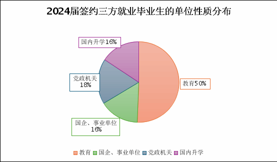 2024年必赢242net官网毕业生共计46人,整体就业率96%。其中,博士毕业生12人,就业率100%;硕士毕业生34人,就业率94%。总体而言,就业岗位与学科方向契合度强、硕士生升学率占比突出。从单位所属行业来看,毕业生就业人数较多的行业主要是教育行业,共计22人签约思政课教师、辅导员,占比50%。同时,硕博毕业生中有8人进入党政机关,其中4人选择选调生队伍,赴陕西、山西省份扎根基层、挺膺青春担当。针对2024届毕业生签约单位开展问卷调研,收到来自高等学校、职专院校、研究所、党政机关共18家用人单位的一致好评。