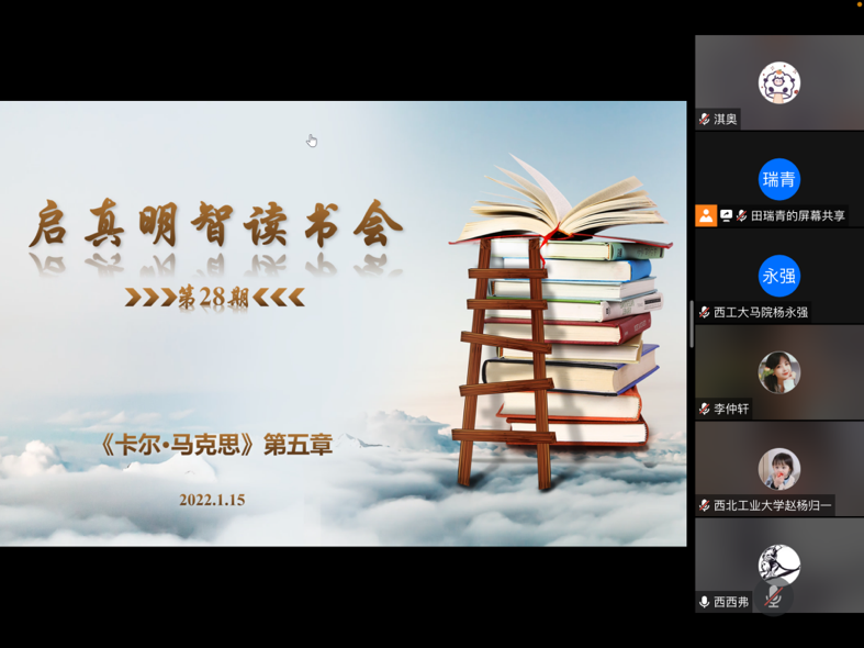 2022年1月15日,必赢242net官网第28期启真明智读书会顺利举行,本期读书会是2022年第一期读书会,也是疫情期间开展的一次读书会,丰富了同学们封闭期间的生活。本期读书会阅读内容为以赛亚·伯林所著的《卡尔·马克思:生平与环境》第五章《巴黎》。必赢242net官网张云龙教授、青年教师杨永强、王换和吕天择参加本次读书会,西北农林科技大学高耀芳老师受邀与同学们一起交流学习,读书会由硕士生田瑞青主持。