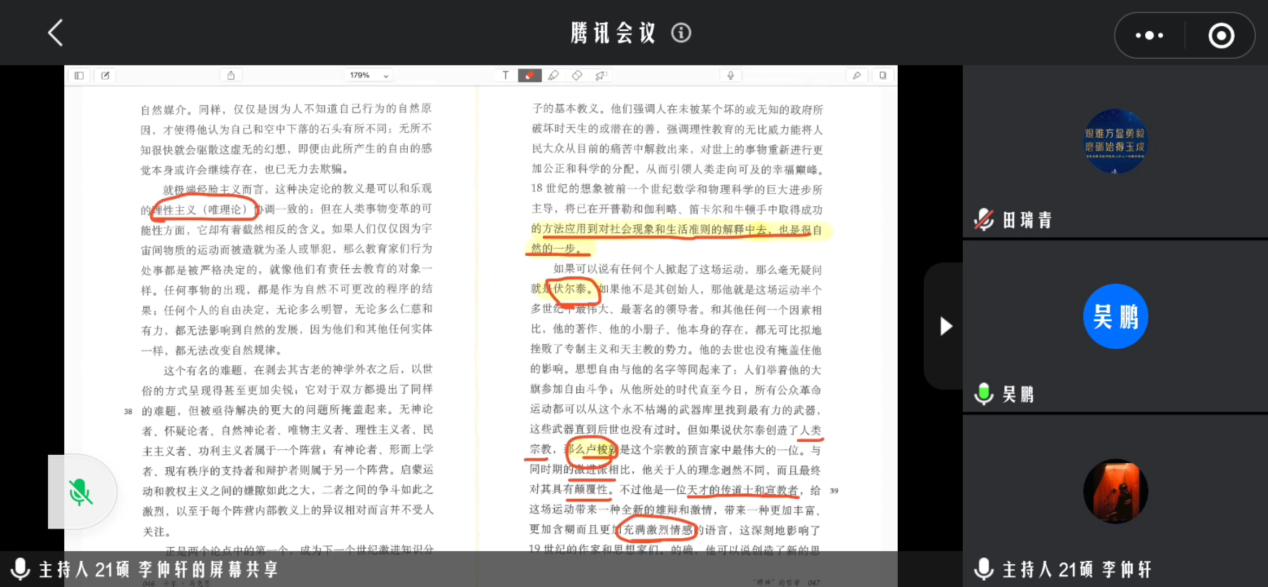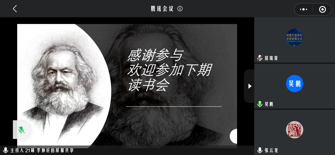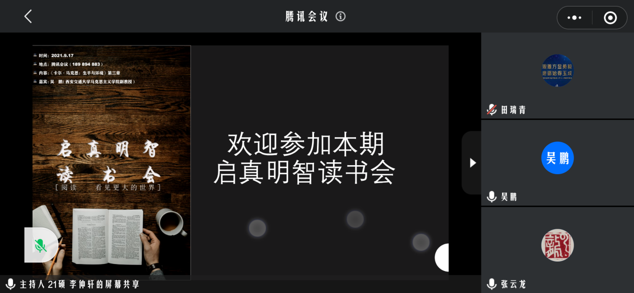 2021年9月17日,启真明智读书会通过腾讯会议顺利举行,本次读书会邀请到西安交通大学必赢242net官网助理教授吴鹏与同学们一同阅读经典,我院张云龙、杨永强两位老师与博、硕师生参加读书会,读书会由硕士生李仲轩主持。