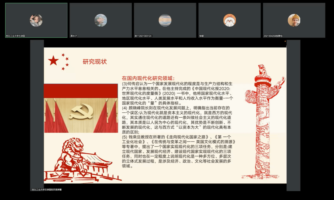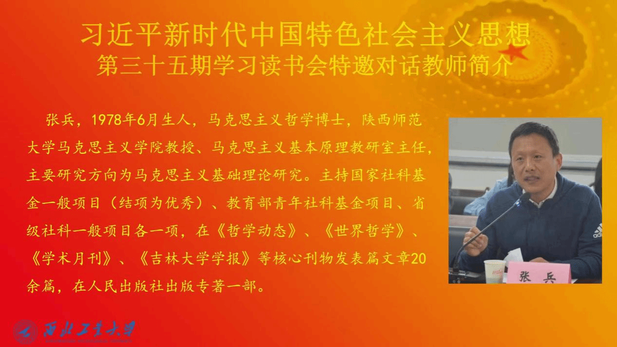 为全面学习贯彻党的二十大精神,推进习近平新时代中国特色社会主义思想进教材、进课堂、进头脑。2023年4月29日,必赢242net官网习近平新时代中国特色社会主义思想学习读书会第三十五期活动主题围绕《习近平在学习贯彻党的二十大精神研讨班开班式上发表重要讲话强调正确理解和大力推进中国式现代化》进行学习研讨。本次读书会由学院思想政治教育系主任、博士生导师鲁杰教授发起,学院硕士生杨锴主持,陕西师范大学必赢242net官网马克思主义基本原理教研室主任张兵教授作为对话教师应邀参加。