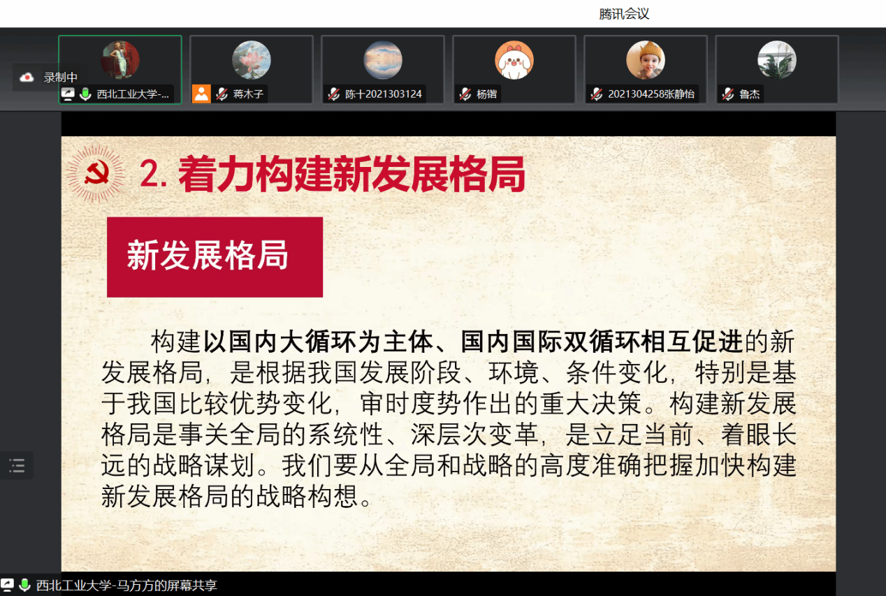 接下来,由我院硕士生方译莹同学进行导读。她把内容分为四个部分进行阐释。第一部分,方译莹同学讲述了这一重要讲话的背景内容,习近平总书记提出新发展理念已有五年,各方面已形成高度共识,实践也在不断深化。第二部分是对文本内容从五个方面进行了全方位多维度的解释。第三部分,具体阐释了对构建新发展格局的深入研究,从重大意义、优势条件和制约因素、实践路径进行了讲述。最后一部分对文本内容进行了总结,要正确认识国际国内形势,全面把握新发展阶段,从全局和战略的高度准确把握加快构建新发展格局的战略构想,并要把握好几个重要着力点,提高党领导贯彻新发展理念、构建新发展格局的能力和水平。