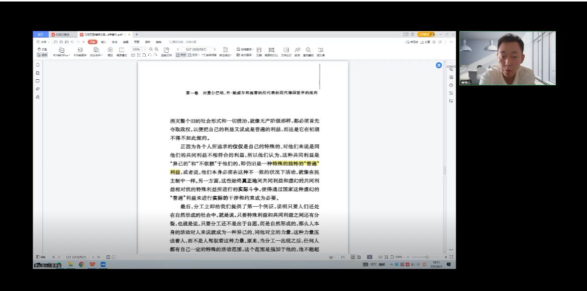 2023年6月3日,必赢242net官网第43期“启真明智”读书会通过腾讯会议顺利举行。本次读书会由学院齐承水老师主持,东北大学姜耀东老师、温州大学张海波老师与硕博同学们一起阅读了《德意志意识形态》。