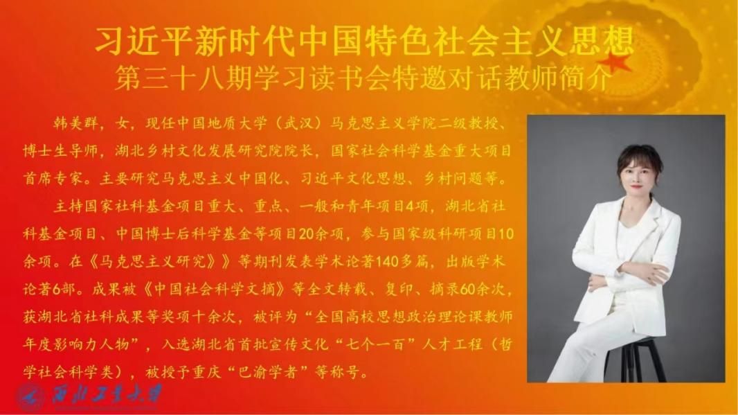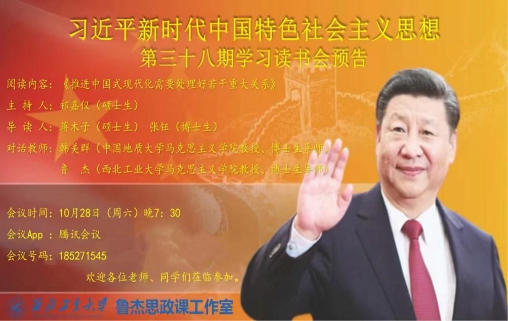 为全面贯彻落实党的二十大精神,推进习近平新时代中国特色社会主义思想进教材、进课堂、进头脑。2023年10月28日,必赢242net官网习近平新时代中国特色社会主义思想学习读书会第三十八期活动主题围绕《推进中国式现代化需要处理好若干重大关系》进行学习研讨。本次读书会由学院思想政治教育系主任、博士生导师鲁杰教授发起,学院硕士生祁嘉仪主持,中国地质大学必赢242net官网博士生导师韩美群教授作为对话教师应邀参加。