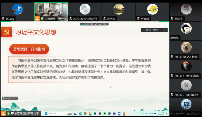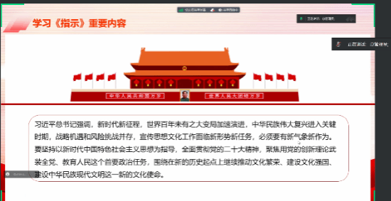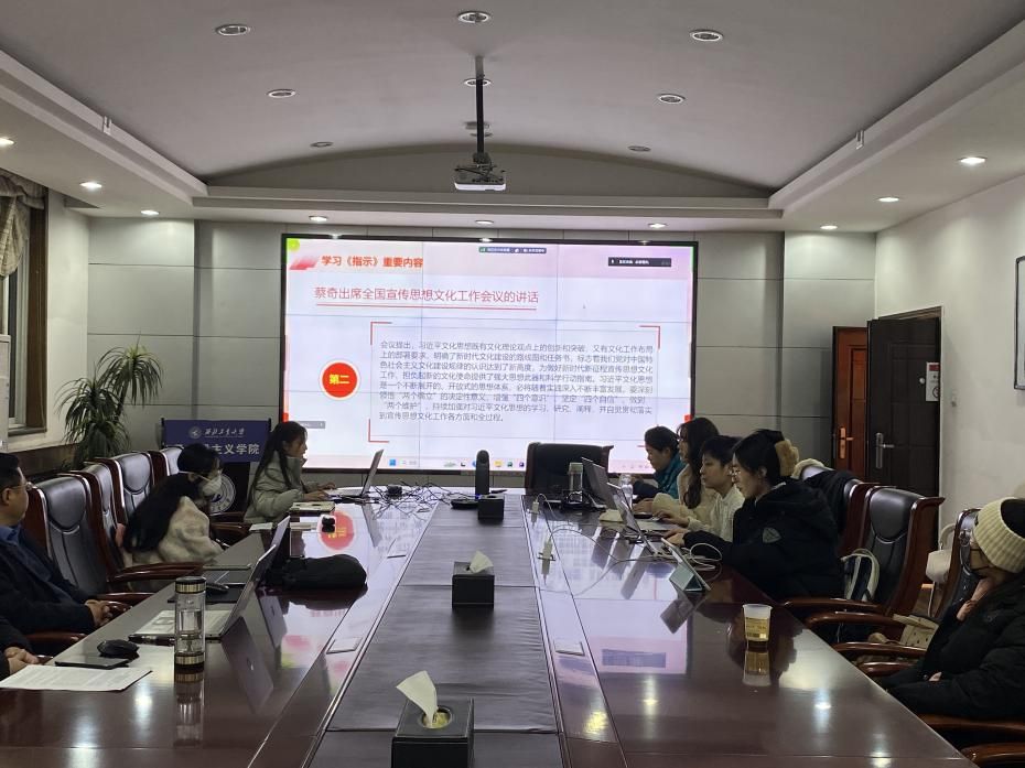 为全面学习贯彻党的二十大精神,推进习近平新时代中国特色社会主义思想进教材、进课堂、进头脑。2023年11月25日,必赢242net官网习近平新时代中国特色社会主义思想学习读书会第三十九期活动主题围绕《习近平对宣传思想文化工作作出的重要指示》进行学习研讨。本次读书会由学院思想政治教育系主任、博士生导师鲁杰教授发起,学院硕士生祁嘉仪主持,西安邮电大学必赢242net官网袁文伟教授作为对话教师应邀参加。本期读书会创新活动举办形式,首次采取线上线下相结合的方式,设置线下分会场,邀请导读同学、对话教师、硕士博士研究生在学院楼208会议室交流学习。