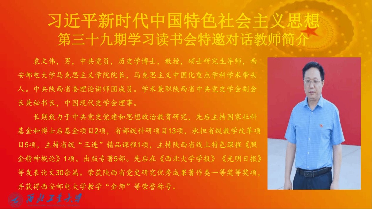 袁文伟,男,任西安邮电大学必赢242net官网院长,马克思主义中国化重点学科学术带头人。中共陕西省委理论讲师团成员。学术兼职有陕西省中共党史学会副会长兼秘书长,中国现代史学会理事。袁教授长期致力于中共党史党建和思想政治教育研究,先后主持国家社科基金和博士后基金项目2项,省部级科研项目13项,承担省级教学改革项目5项,主持省级“三进”精品课程1项,主持陕西省线上特色课程《照金精神概论》1项。出版专著5部。先后在《西北大学学报》《甘肃社会科学》《晋阳学刊》《光明日报》等发表论文30余篇。先后荣获陕西高校人文社会科学研究优秀成果三等奖、陕西省党史研究优秀成果著作类二等奖、陕西省党史研究优秀成果著作类一等奖等多项奖项,曾获陕西省人文社会科学青年英才计划、西安邮电大学“西邮新星”团队建设等计划支持,并被评为学校优秀共产党员、西安邮电大学优秀党务工作者、西安邮电大学“四有好老师”、西安邮电大学教学“金师”诸多荣誉称号。