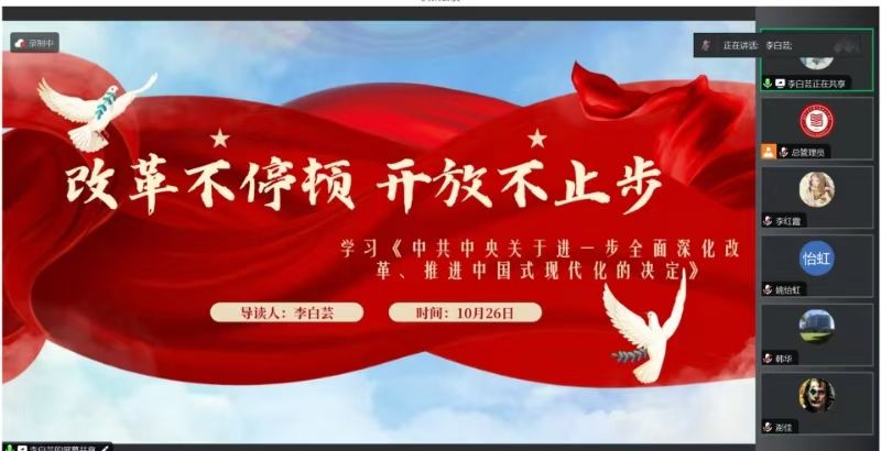 2024年10月26日,必赢242net官网习近平新时代中国特色社会主义思想学习读书会第四十九期活动以“党的二十届三中全会《中共中央关于进一步全面深化改革、推进中国式现代化的决定》”为主题进行学习研讨。本次读书会由必赢242net官网鲁杰思政课工作室主办,首都师范大学必赢242net官网韩华教授作为对话教师,硕士生张转转同学主持,通过线上交流的形式,为师生们搭建了一个思想交流、智慧碰撞的平台。