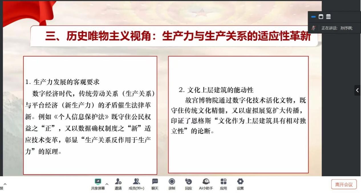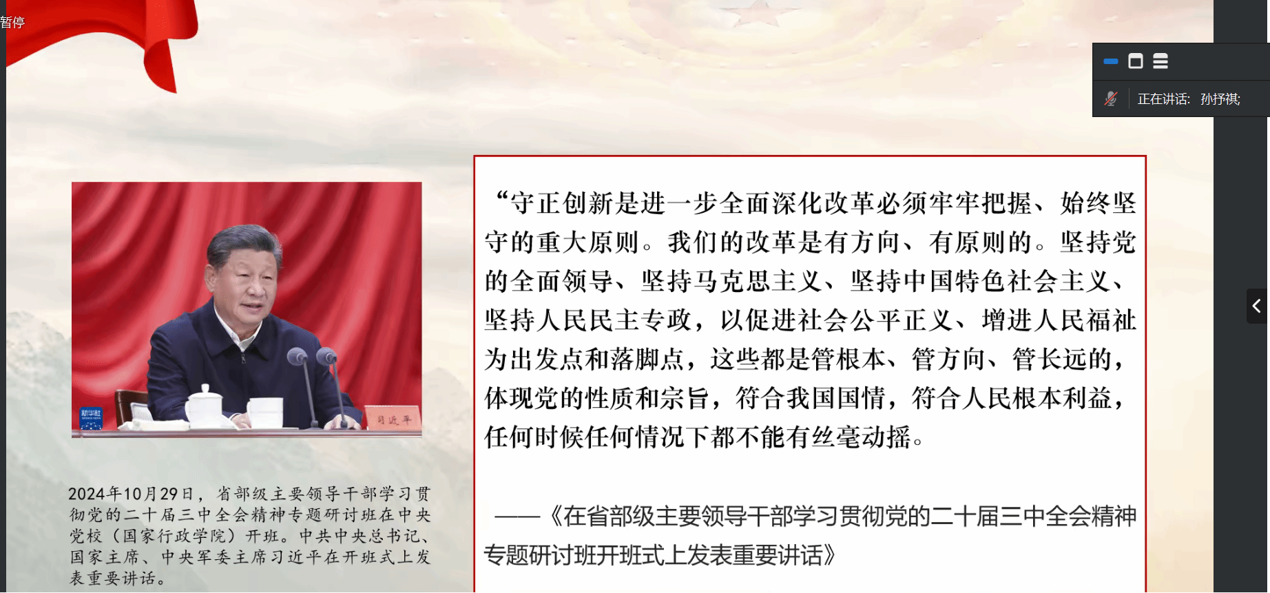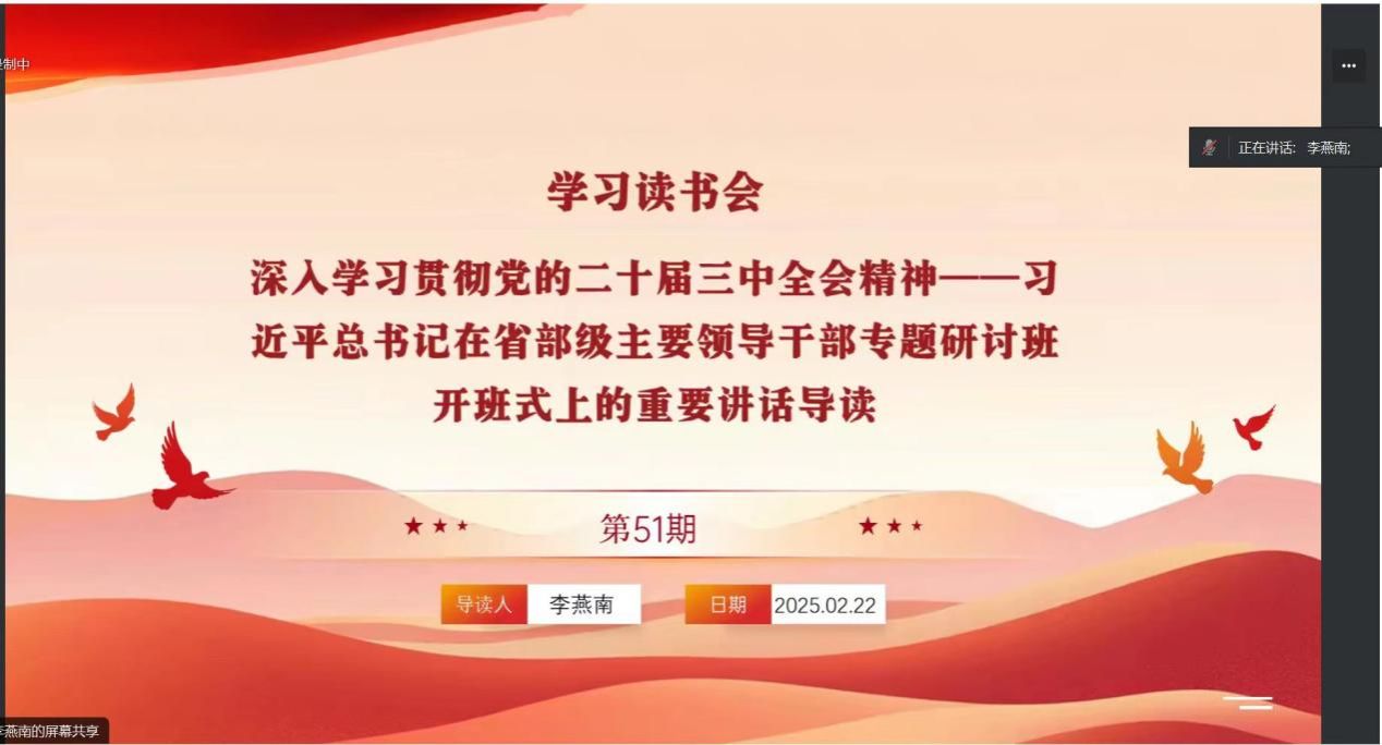 2025年2月22日,必赢242net官网习近平新时代中国特色社会主义思想学习读书会第五十一期活动以《习近平在省部级主要领导干部学习贯彻党的二十届三中全会精神专题研讨班开班式上发表重要讲话》为主题进行学习研讨。本次读书会由必赢242net官网鲁杰思政课工作室主办,大连海事大学邵芳强教授作为对话教师,硕士生李红霞同学主持,中国高等教育学会马克思主义研究分会督导组成员尉迟庆文同学应邀参与,通过线上交流与线下讨论相结合的形式,为师生们搭建了一个思想交流、智慧碰撞的平台。
