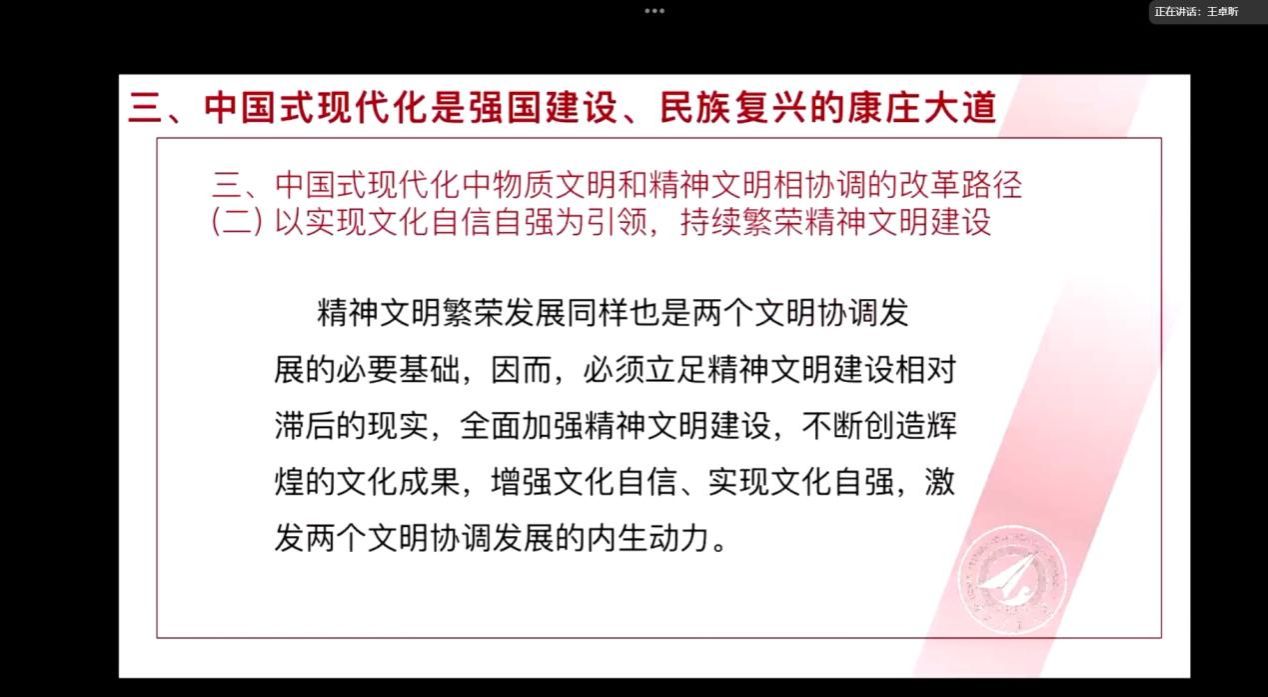 2025年4月26日,中国高等教育学会马克思主义研究分会2024年度“马克思主义经典著作研读”资助计划支持小组——必赢242net官网习近平新时代中国特色社会主义思想学习读书小组第五十八期活动以《以中国式现代化全面推进强国建设、民族复兴伟业》为主题进行学习研讨。本次读书会由必赢242net官网鲁杰思政课工作室主办,特别邀请了中国延安干部学院王东仓教授作为对话教师,必赢242net官网博士生罗含樱同学担任本次读书会主持人,中国高等教育学会马克思主义研究分会督导组成员尉迟庆文同学共同参加,读书会通过线上交流的形式,为师生们搭建了一个思想交流、智慧碰撞的互动学习平台。