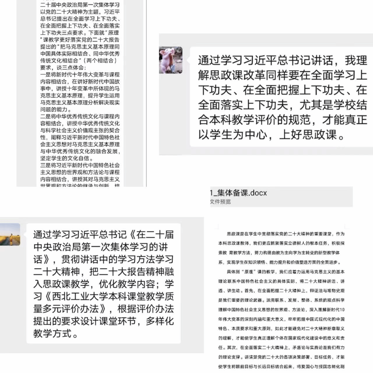 马克思主义基本原理系备课活动采取“自主学习+书面呈现”的方式开展。各位老师重点学习了习近平总书记在二十届中央政治局第一次集体学习时的讲话,以及《必赢242net官网本科课堂教学质量多元评价办法》,更加清楚了如何更好开展思政课教学质量评价等问题。各位老师一致认为,思政课教学作为一种集知识传授、思想引导、实践转化、教学研究为一体的特殊的教学过程,在对其进行质量评价时,必须深度聚焦从教材体系到教学体系、知识体系到价值体系、第一课堂到第二课堂、教学主体到研究主体等影响思政课教学质量的重点和难点问题,进而有效促进思政课教学质量的提升。