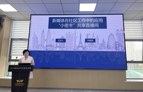 随后,实践团来到立丰城社区。立丰城社区党总支部书记、居委会主任赵青青围绕头雁便民集市、两新群体参与基层治理、“1245”工作模式、“小密丰”益商联盟、志愿者团体发展、新就业群体暖心驿站等亮点工作进行了介绍。实践团参观了头雁便民集市服务点、党群服务中心外连廊、立丰城商圈党群服务中心、共享直播间等社区党建阵地。立丰城商圈党群服务中心依托商圈资源,创新成立了益商联盟和小密丰志愿者队。该中心将流动党员管理站、新就业群体服务站、社会治理网格化工作站和社会工作服务站这四个服务站点的功能进行了整合,形成了综合性服务平台。立丰城商圈党群服务中心建立了“小密丰”共享直播间,积极探索以直播等新媒体助力社区治理、深化党群互动的新模式。陕西广播电影电视协会融媒体专业委员会主任闫晓萌以“小密丰”共享直播间为例,为实践团讲授了“新媒体在社区工作中的应用前景”专题课程。