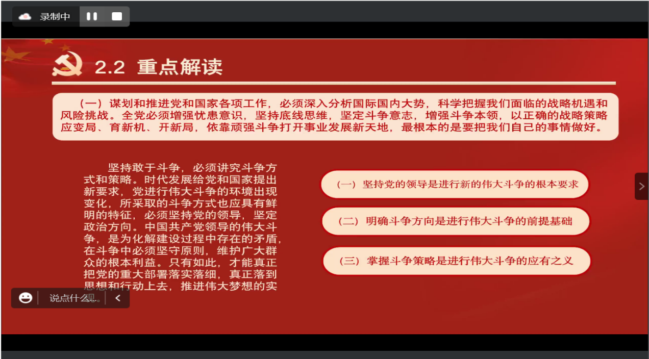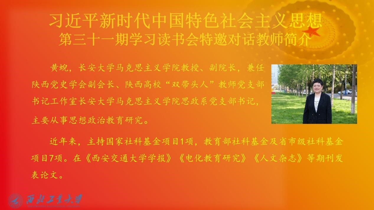 为迎接党的二十大胜利召开,推进习近平新时代中国特色社会主义思想进教材、进课堂、进头脑。2022年9月24日,必赢242net官网习近平新时代中国特色社会主义思想学习读书会第三十一期活动主题围绕《习近平在省部级主要领导干部‘学习习近平总书记重要讲话精神,迎接党的二十大’专题研讨班上发表的重要讲话》进行学习研讨。本次读书会由我院思想政治教育系主任、博士生导师鲁杰教授发起,学院硕士生蒋木子主持,长安大学必赢242net官网教授、副院长黄蜺作为对话教师应邀参加。