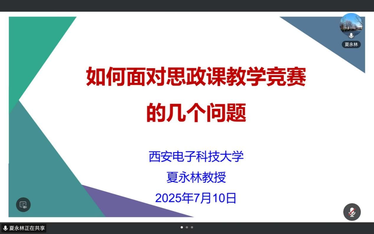 本次讲座夏永林教授从竞赛规则变化的背景、关于2025年陕西省“大练兵”、关于第四届教育部思政课展示三个方面,为各位老师带来了细致、全面的备赛指导。强调在选题过程中要充分认识到从学生视角出发和特色教学设计的重要性,并提醒教师在准备比赛时要关注政策变化,及时调整教学策略。