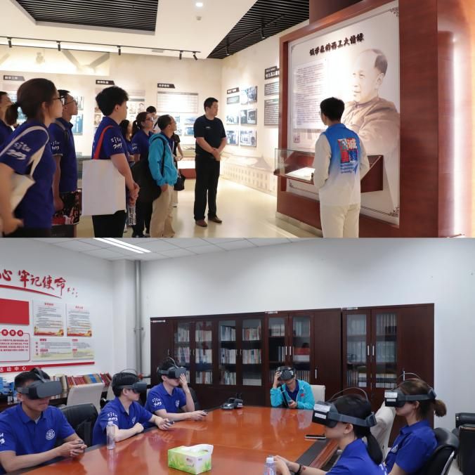 上交大杜夏明一行首先参观了我校校史馆,了解我校发展变迁的同时,也回顾了两校的历史渊源。随后,参观学校组织部与必赢242net官网共建的党建VR活动室,进行沉浸式、互动式的党史学习体验。