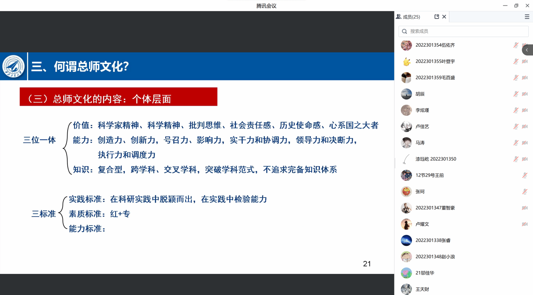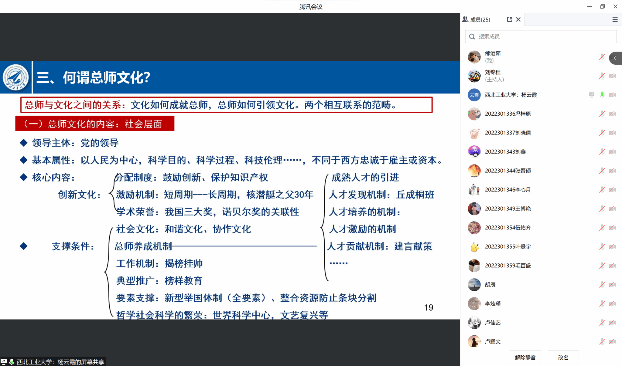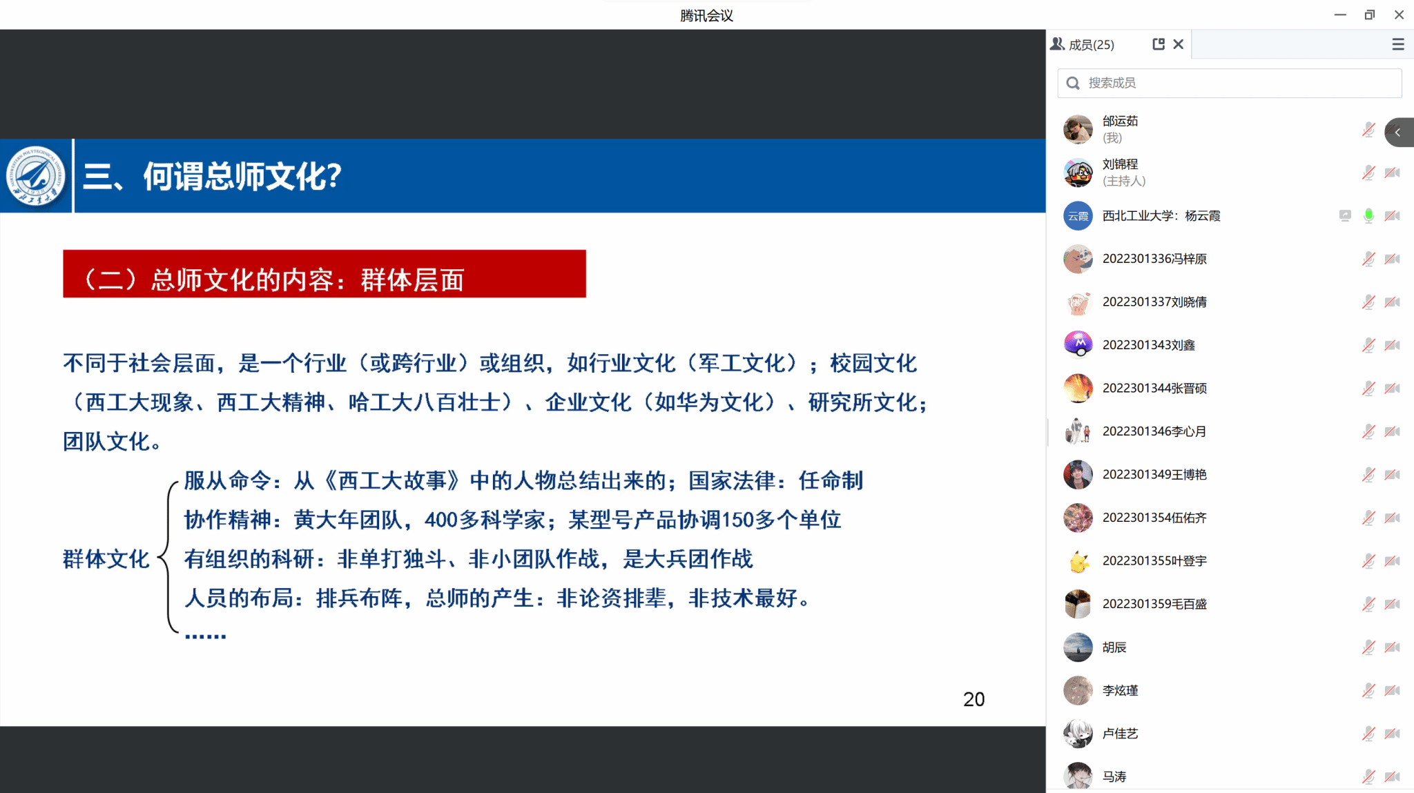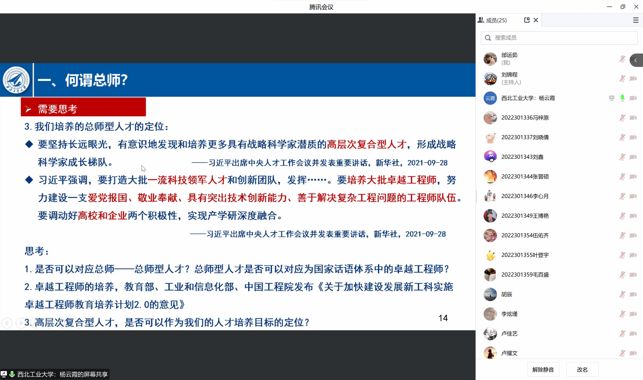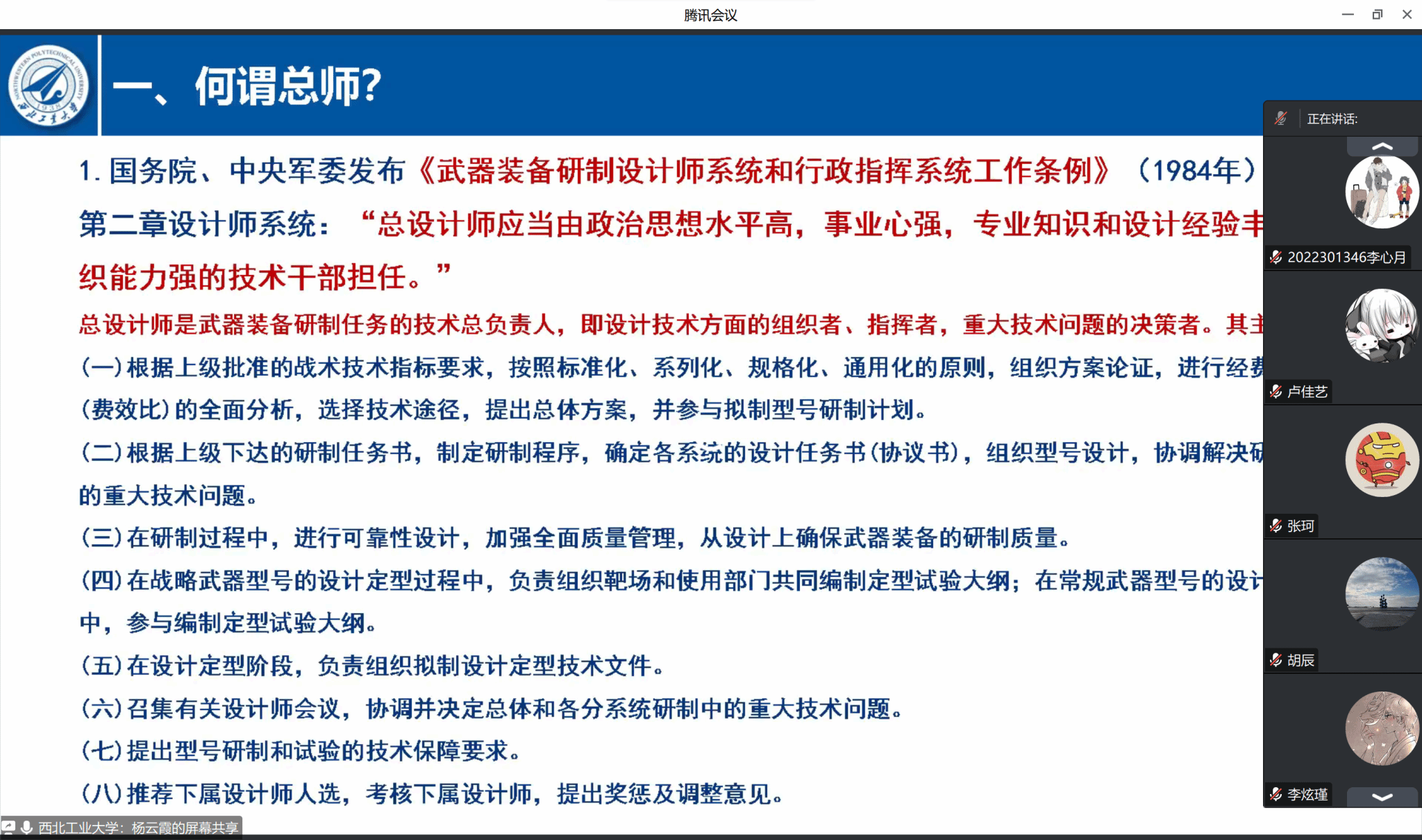 2023年6月11日上午8:30,必赢242net官网院长杨云霞为其联系的DL032207班在线讲授了主题为“对总师文化及‘总师型’人才培养的一点思考”的思政课,班级25名同学全体参与并展开了研讨。