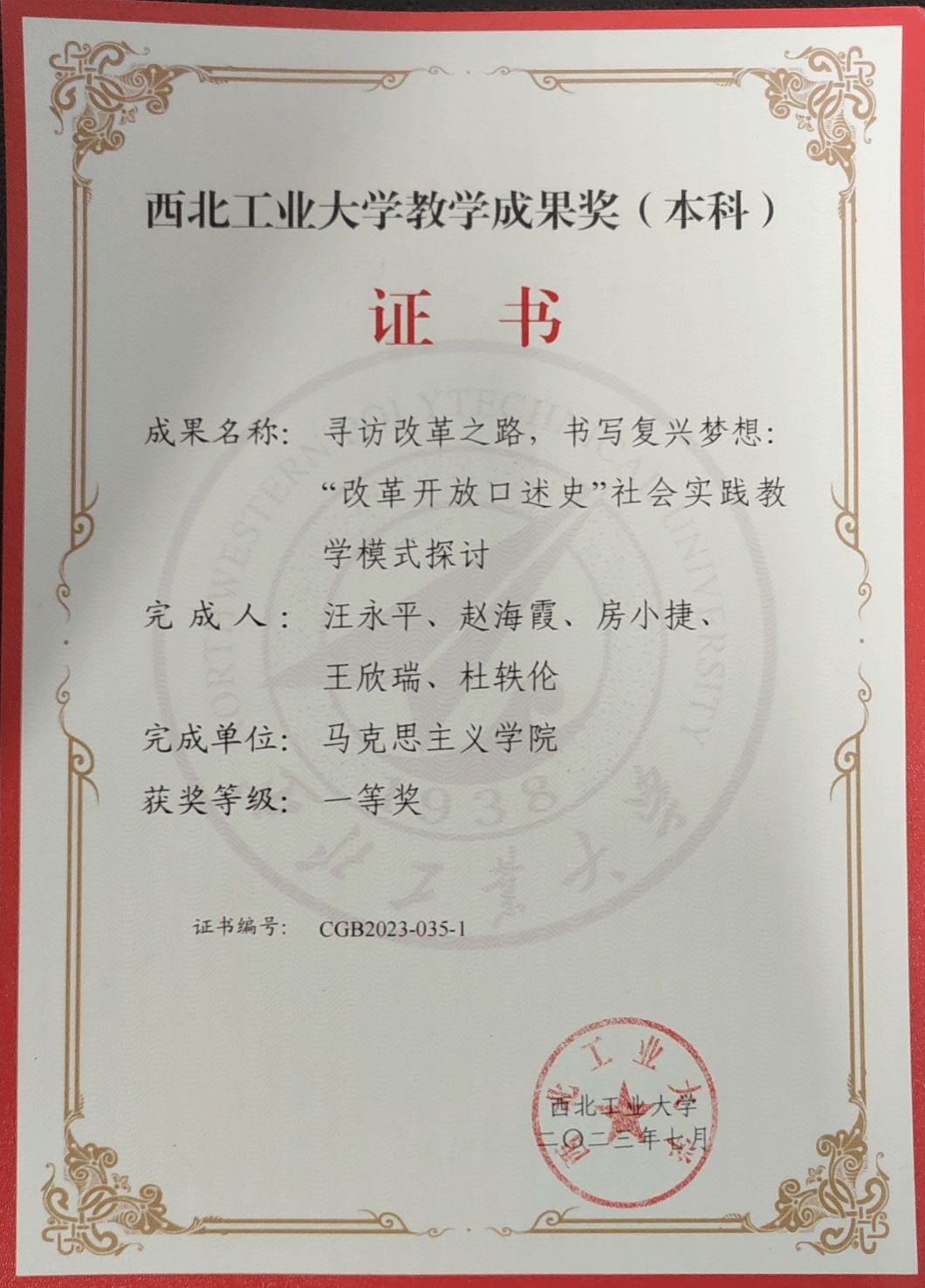 从2018年起,汪永平老师主持了《中国近现代史纲要》课程中开展的“改革开放口述史”社会实践。作为负责人,汪永平老师带领课程团队,对学生进行指导。她亲自拟定教学大纲,制定操作规范,聘请专家对师生进行培训,指导学生撰写报告,主持优秀口述史的颁奖,并带领学生进行暑期社会实践,参加“口述史国际周”学术活动等,形成完整的教学科研闭环。在教学理念、教学方法、教学模式、教育路径方面进行系统改革,在课程实践性、研究性、思想性及整体性等方面都取得明显成效。六年来,使众多授课学生增强了制度自信、道路自信与文化自信,增强了国家认同感与政党认同感。该项目获得2023年必赢242net官网“优秀教学成果奖”一等奖。