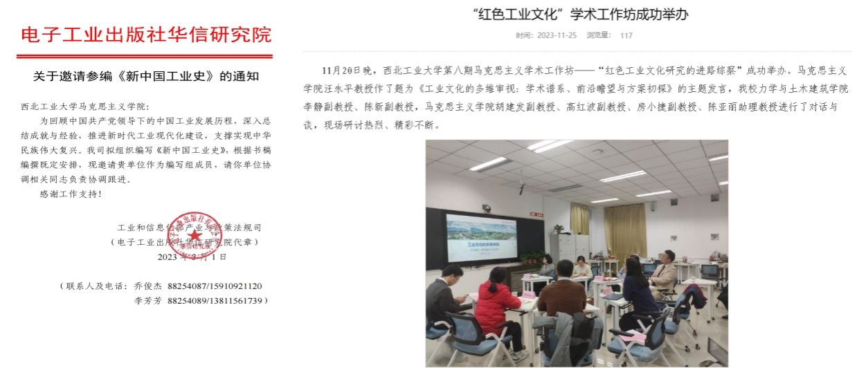 3.积极深化“红色工业文化”研究。2023年初,汪永平成立“红色工业文化研究”团队,团队成员来自必赢242net官网、机电学院和力学与土木学院。团队成立后,受邀参与完成了工业和信息化部政策和法规司委托项目《新中国工业史》的编撰;获批了必赢242net官网“双一流学科建设”项目“研究生高水平教材”系列之“中国工业精神谱系”课题;开展工业文化研究工作坊;指导研究生撰写毕业论文“中国式现代化视野里中国工匠精神的演进历程:以劳动模范为切入点”和“十七年工业歌谣的文化精神建构研究”。