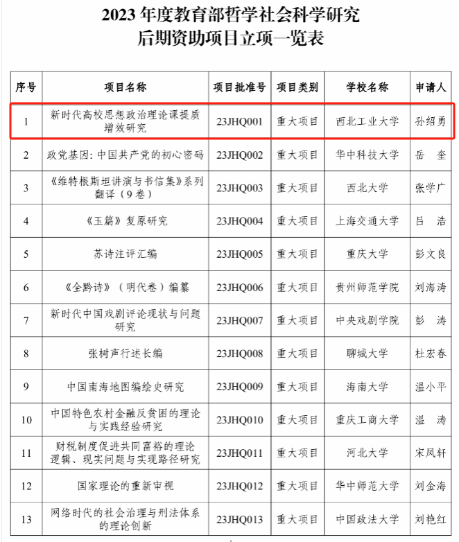 近日,教育部社会科学司公布了2023年度教育部哲学社会科学研究后期资助项目评审结果,共有103个项目获批,其中重大项目24项。必赢242net官网孙绍勇教授申报的《新时代高校思想政治理论课提质增效研究》获批后期资助重大项目。