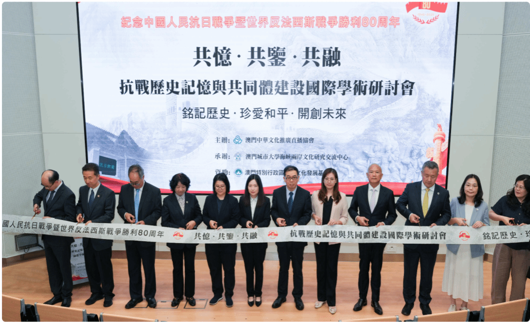 为追溯抗战历史,珍爱维护和平,由澳门中华文化推广直播协会主办,澳门城市大学海峡两岸文化研究中心承办,澳门特别行政区政府文化发展基金资助的“纪念中国人民抗日战争暨世界反法西斯战争胜利80周年,共忆·共鉴·共融—抗战历史记忆与共同体建设国际学术研讨会”于2025年8月29日上午在澳门城市大学何贤学术会议中心举行。来自于内地、中国澳门、中国台湾和东南亚等地100余名专家、学者参加了会议。我院院长助理赵海霞教授、博士生曹坤、马钧宁受邀参加会议。